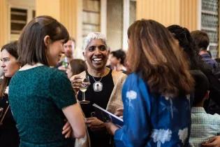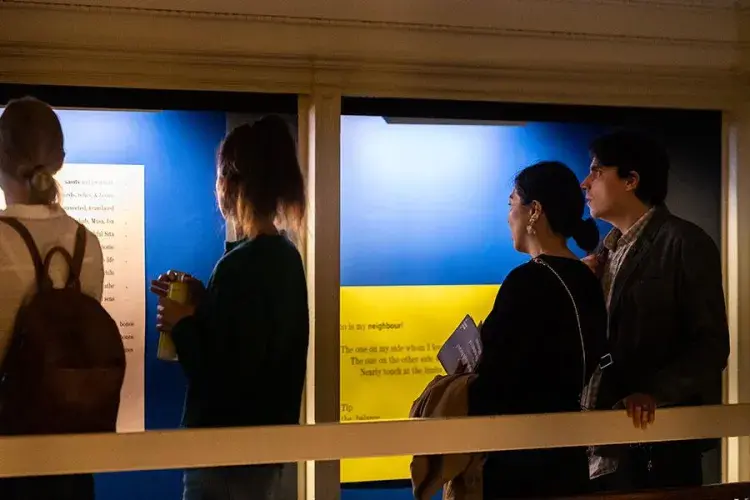 We speak to Hephzibah Israel about the research and creative process behind her exhibition மொழிபெயர்ப்பு / the nature of difference. மொழிபெயர்ப்பு / the nature of difference is an exhibition of 20 text-based artworks by Dr Hephzibah Israel on the nature of translation and what it is to navigate borders. The show is running at Talbot Rice Gallery until 30 September 2023, including as part of Edinburgh Art Festival. It is produced in collaboration with Fraser Muggeridge studio.Through each text, presented as poster vignettes in individual bays of the Georgian space, Israel poses questions "In your language or mine?" and prompts us to consider our own perceptions of borders.We caught up with Hephzibah to ask how the show came about, how it relates to her research and teaching in Translation Studies at the University of Edinburgh, and what she hopes audiences will take away from it.An idea and a challenge An exhibition visitor contemplates one of the panels. Photo: Sally Jubb The idea for மொழிபெயர்ப்பு / the nature of difference came, Hephzibah recalls, “as a result of some exciting conversations I had been having with Talbot Rice Gallery and its artists on multiple interpretations of translation and how these intersect with art and politics”.In January 2023, for example, she was one of four invited academics from the University to discuss the theme of borders from different disciplinary perspectives, and how they thought about them in their own work, for artist Lara Favaretto’s Thinking Head: Clandestine Talks series.Within weeks of the Clandestine Talk, the Gallery had commissioned Hephzibah to create her own artwork on the theme of translation and borders as part of its summer exhibition programme. She was able to interpret the theme as broadly or as narrowly as she wished, but limited to doing so in no more than 10-15 words per piece.“I thought it was going to be impossible!”, reflects Hephzibah, “but I found this creative tension nurtured artistic writing. The challenge to be poetic in such few words was both invigorating and constraining, and once I started writing, I could not stop!”.Personal and private, public and politicalThe exhibition draws on Hephzibah’s critical work on the translation of sacred texts in its commentary on border crossings "between the sacred and mundane, the sacred and secular, between human and divine migrations".While working on the panels, she was simultaneously co-writing an academic chapter on the use of translation by South Asian migrant communities when speaking of their religious practices and community cohesion in the UK today.Describing the series of 20 panels, she says “I have deliberately woven the deeply personal and private with the public and political as this is an area that interests me in my research on translation and the creation of autobiographical subjects in personal accounts”.“Throughout, I intersect poetry and language use with issues of power, migration, and empire in translation that I have written about academically”. It was really great to think about translation in such a different space. I enjoyed how the poems use different languages, giving fresh perspectives on some of the metaphors of translation we use in translation studies (and generally to talk about translation). 'invisible' was one of the panels that really stayed with me. I found it interesting to see visibility linked to people in this way. It made me think of how this (silent) expectation of incomers to adapt/get on with things without making a fuss renders people invisible. Dr Karin Bosshard, Teaching Fellow in Translation Studies, responding to the nature of difference As well as her research, Hephzibah credits her teaching in translation as creative practice as being a huge help in creating the exhibition.“I have spent so many wonderful hours discussing creative strategies and approaches to translating and writing with my students over the past ten years at Edinburgh that I think they must have percolated into my subconscious in a way that released me to enjoy the process of writing creatively.”“Beyond the words on the ‘page’, I was also thinking of multiple other factors - something I invite my students of translation to do. The space where the artwork would hang, and how I could best use it, of my audience, colours, the interaction of multiple scripts and fonts.”“This writing was no longer an academic point for discussion but in action! And what better theme to write on than translation—something that I enjoy researching, writing about, thinking critically and teaching?” Applied to translation, thoughts on positive aspects of borders might link to translation as potential enrichment, with borders serving to stake out the limits of positive interaction. In this respect, maybe translation holds out the possibility not so much of rejecting borders but of transforming how we see them. David Hayes, PhD student in Translation Studies, responding to the nature of difference Both visible and invisibleAsked what she hopes audiences will get from the exhibition, Hephzibah says “I want [them] to think critically about the presence of borders around us all - both visible and invisible - and to what extent translation may or may not facilitate the crossing of borders.""Having crossed borders myself, multiple borders at that, I know what effects these have had on my life - some positive and others not as good. Through this exhibition, I wanted to create a space where audiences could relate to a range of experiences in border crossings - what do these borders mean for each of us? How do we negotiate them on an everyday basis? And, importantly, how do we respond to broader political discourses on borders, whether or not they directly affect us?”. Hephzibah Israel (centre) at the opening of the exhibition. Photo: Sally Jubb “What I hope audiences will also